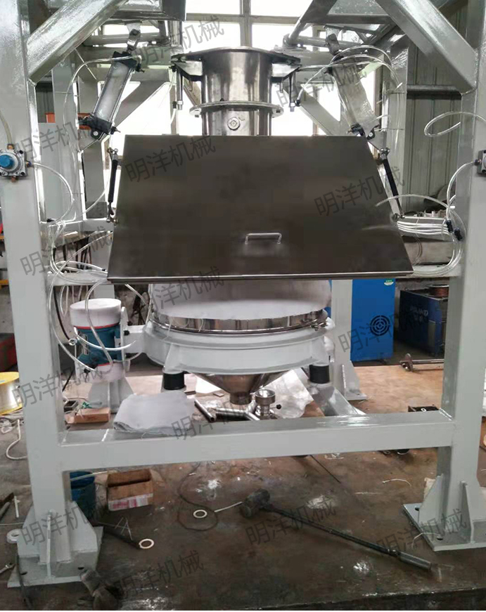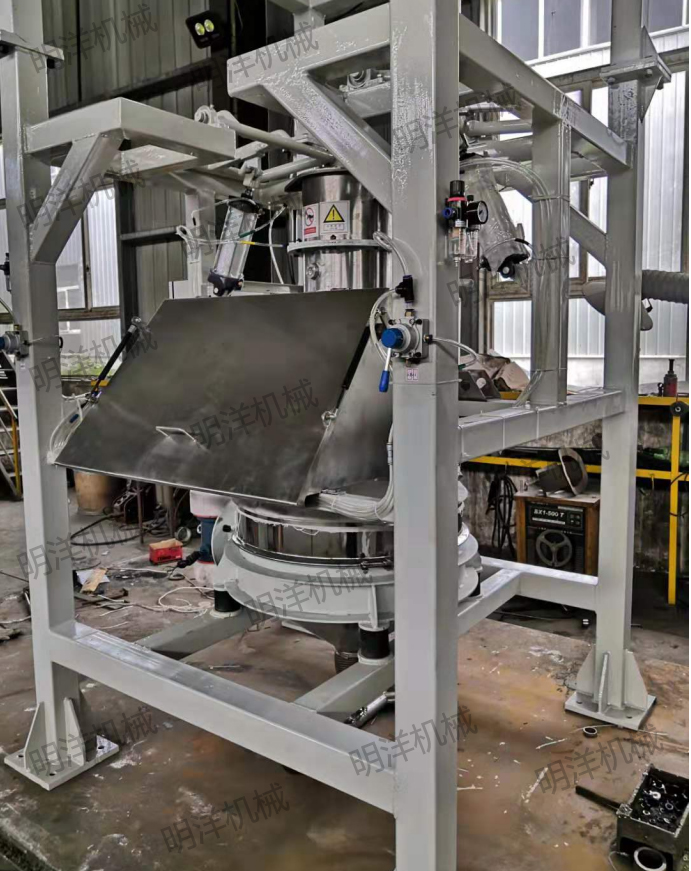 MYDWT-1噸包投料站是通過電動葫蘆或叉車提升料袋至投料口,人工通過手套箱將包裝袋下料口拆開后,包裝袋內的物料通過自重落到下方料斗中。